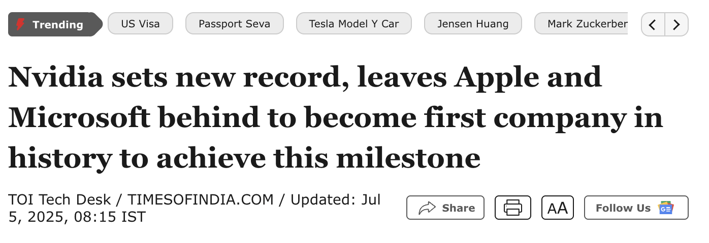Nvidia Sets New Record, Leaves Apple and Microsoft Behind to Become First Company in History to Achieve This Milestone