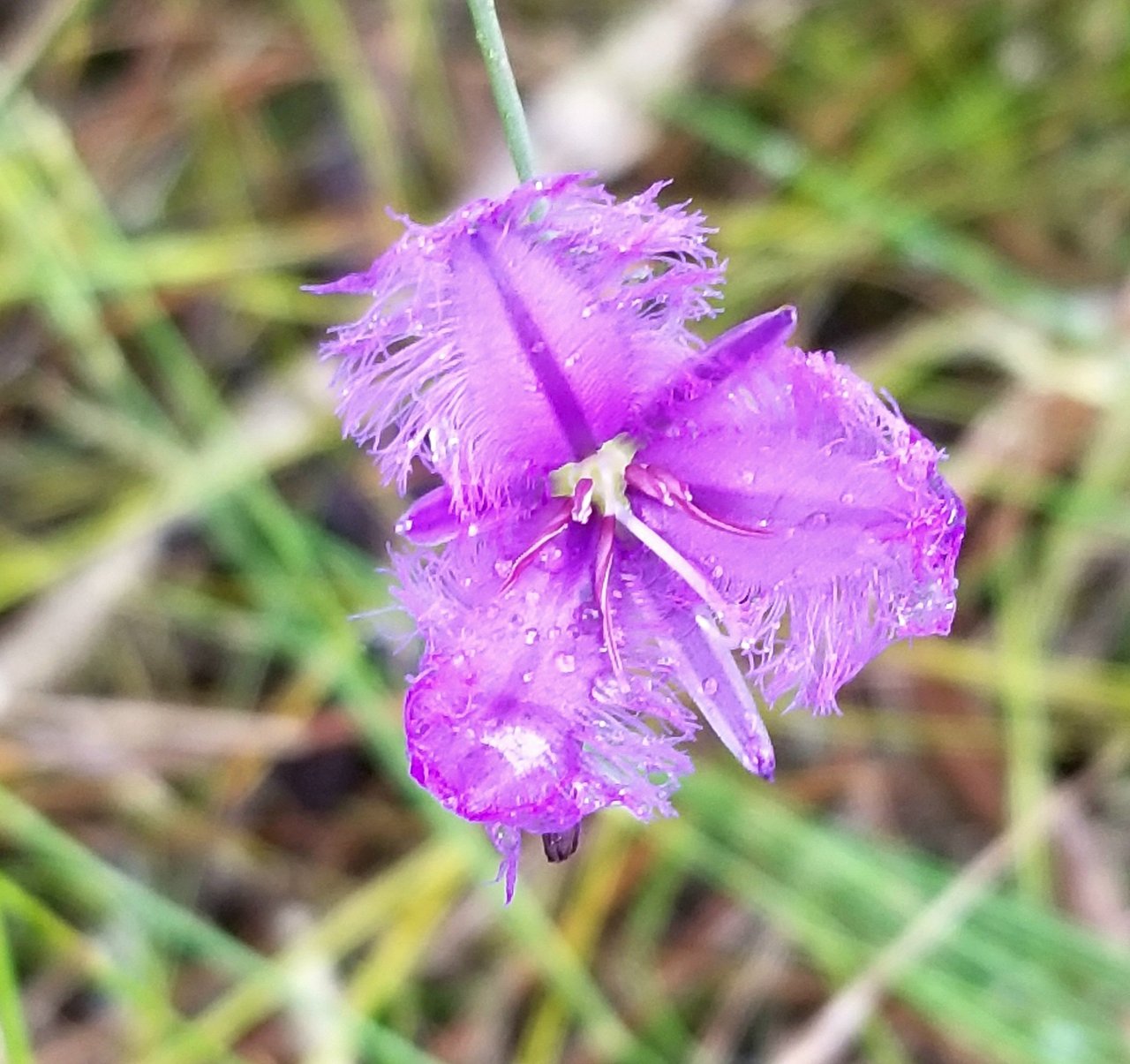 A bedraggled purple fringe lily - rain plays havoc with the fringed bits