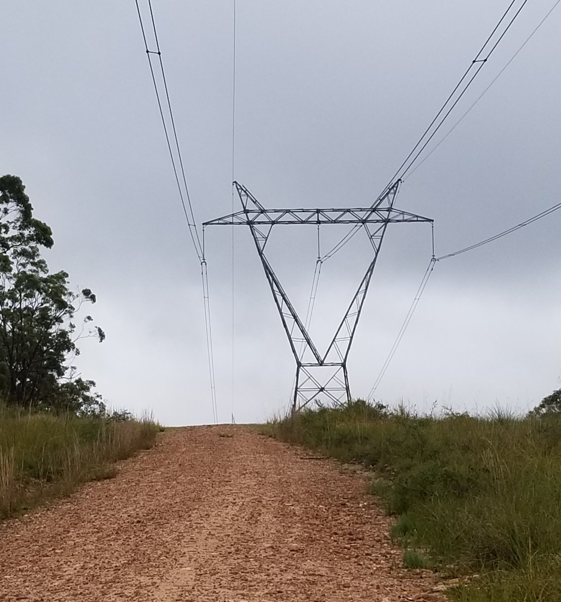Under the powerlines on a bleak rainy umbrella day