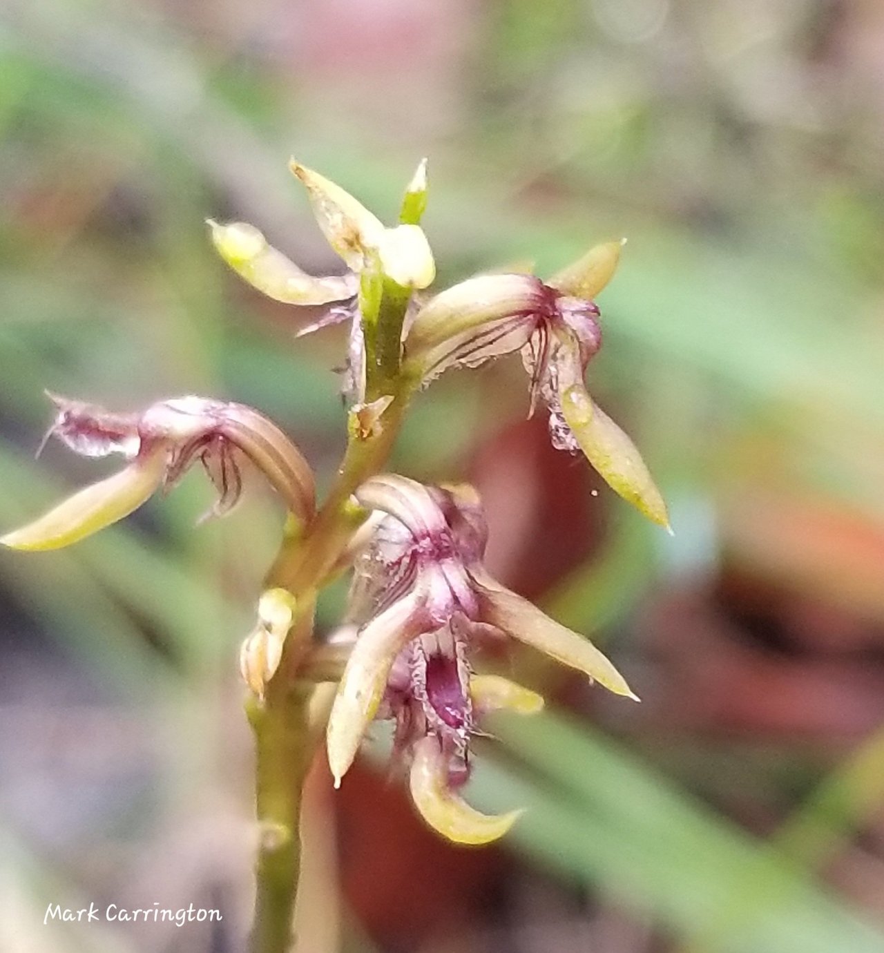 No midge orchids in last year spot - been smashed by the track work done during the winter - 4 plants last time - none now. Did find one flowering in the next normal spot - fringed midge orchid - corunastylis fimbriatus. Just one flower - bashed by the heat and the rain