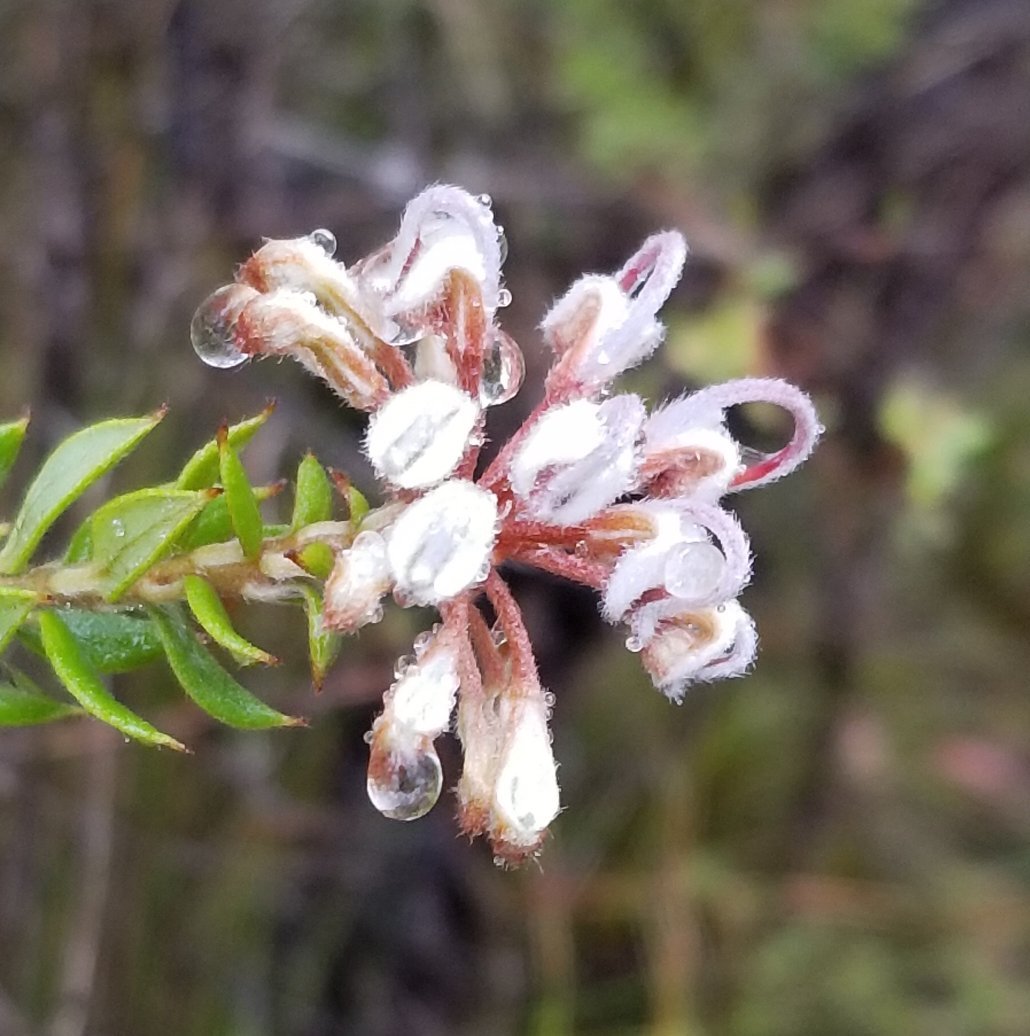 Got in the car to walk an often walked track in Ku-ring Gai Chase NP - almanac was telling me there could be midge orchids and the endangered cryptostylis hunteriana. Did need an umbrella - first photo sets the theme - raindrop flowers. Pine-leafed geebung