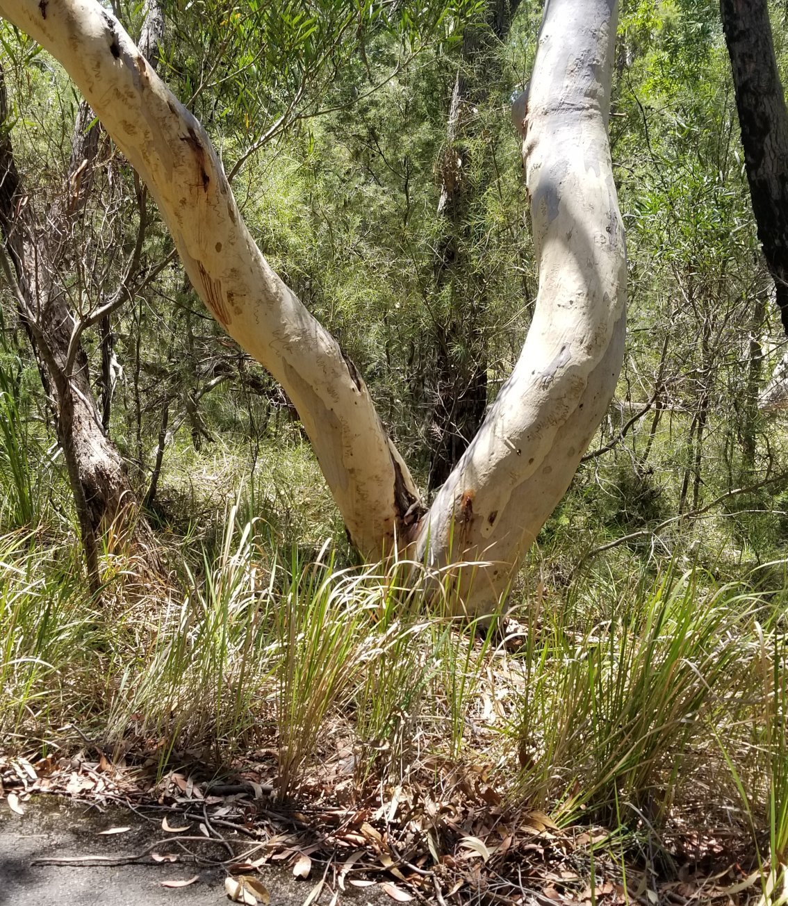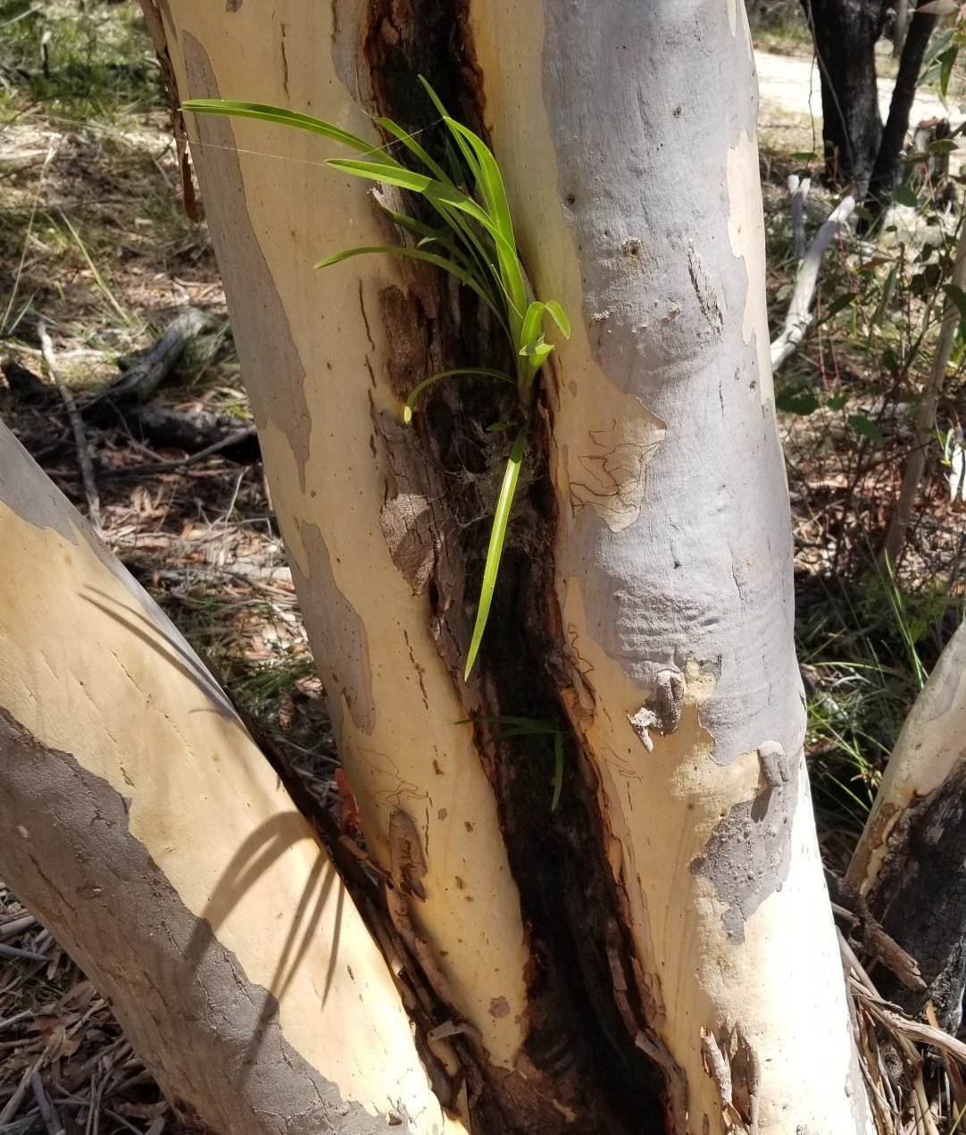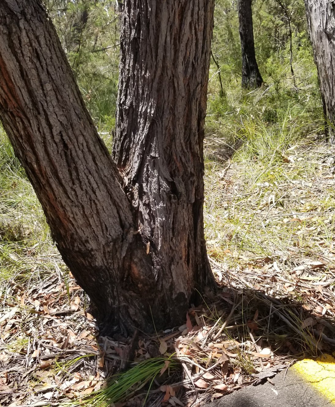Last clue photo - not a scribbly gum and not yellow - but it has formed a V above the ground