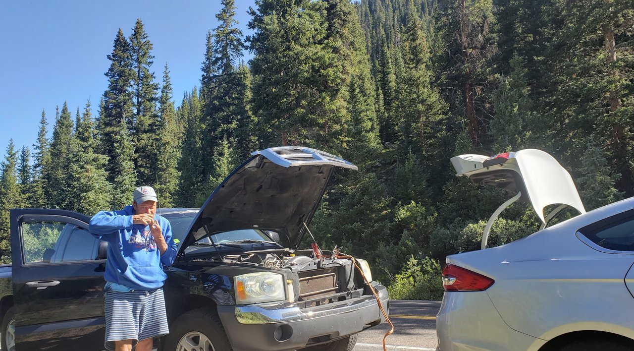 So I had 2 mystery shops on the way back today.. Snowmass and Aspen then up Independence Pass... @bethvalverde will be posting a bunch of pics later.. but here's the #ophumanangel mission.. we came across this couple broke down in their hybrid.. dead battery.. go figure.. I had cables so I gave them a jump.. funny their battery is in the trunk.. I smoked a bowl while it charged..