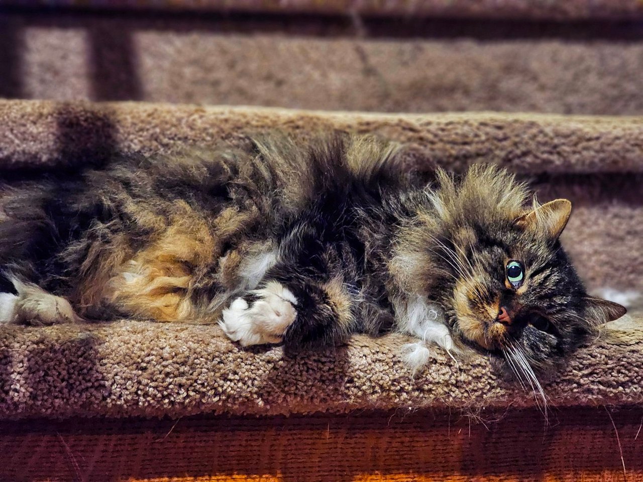 And of course, we found Le Chat in one of her new favorite spots, the stairs. She's often there playing, or just hanging out. She changes her preferred spots from time to time, she's funny.