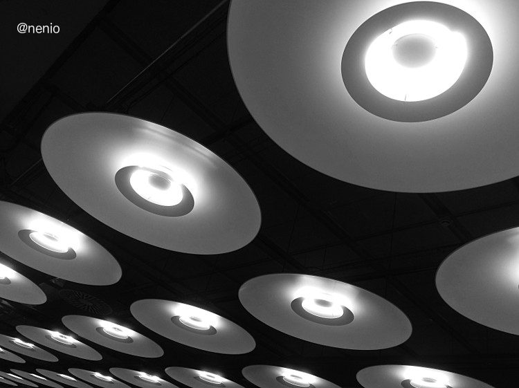 Recientemente publiqué un de fotografías “inusuales” de techos, donde mencionaba la importancia de mirar hacia arriba buscando imágenes interesante. En ese mismo espirito muestro esta fotografía de un arreglo de varias hileras de luces. El formato blanco y negro da un contraste bastante llamativo. Muchas veces los techos son fuente de buenas fotografía. La presente fue tomada con la cámara de un iPhone 5S.
