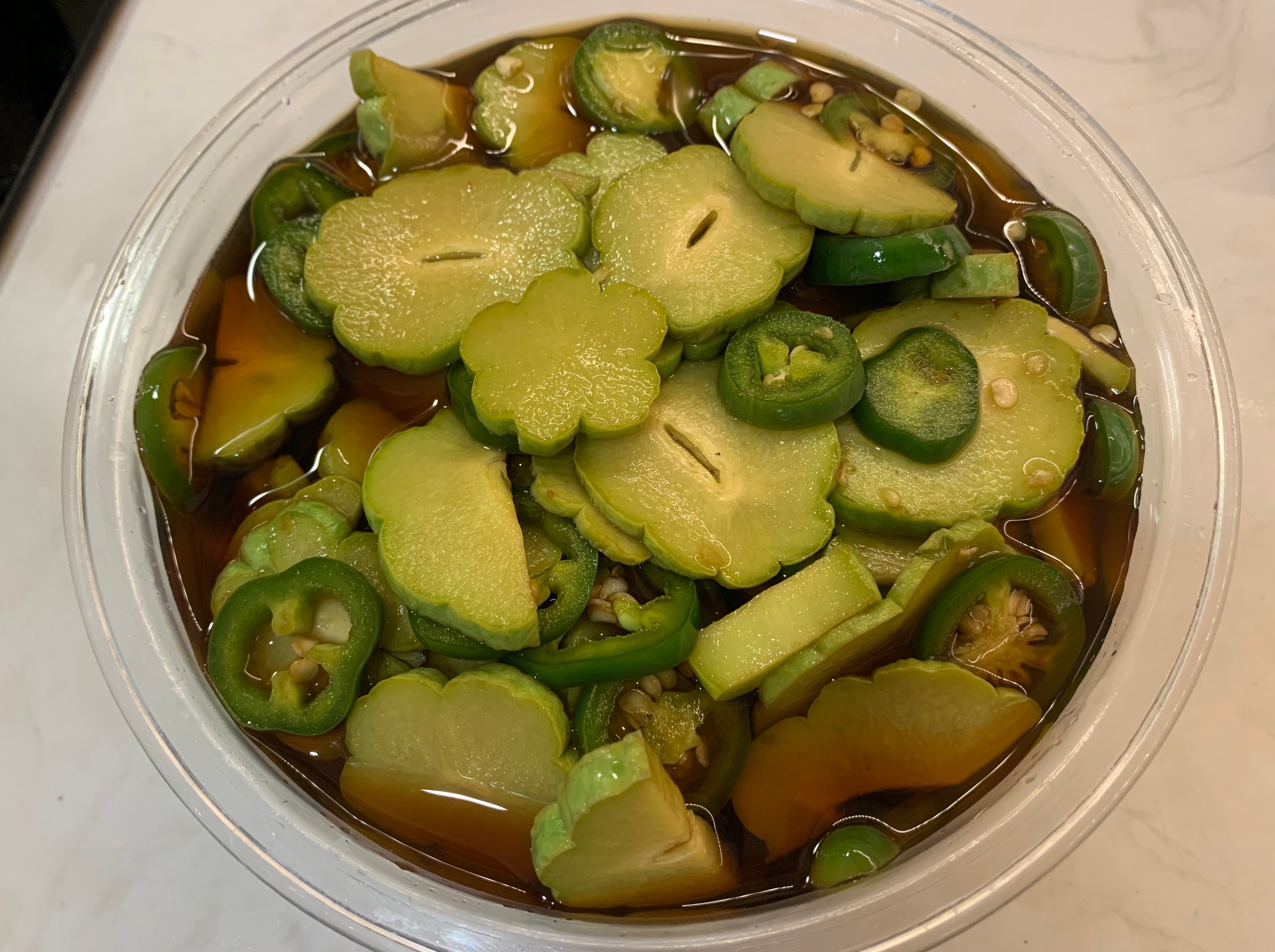 보통 사이즈의 차요테는 씨를 제거한 뒤, 4등분으로 잘라 1cm 내외의 두께로 얇게 슬라이스 해주시면 되는데, 저는 작은 사이즈의 순차요테를 써서 조금 큰건 2등분, 아주 작은건 그냥 슬라이스 해줬어요.할라피뇨도 1cm 내외로 얇게 슬라이스 합니다. 모든 재료는 스테인리스 혹은 유리 볼에 담아주세요.