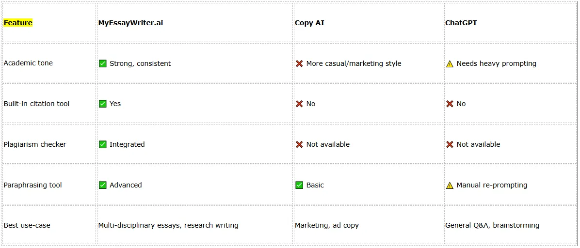 Many students compare AI essay writing help tools like Copy AI, ChatGPT, and MyEssayWriter.ai. While all can generate content, MyEssayWriter.ai’s specialization in academic writing makes it stand out.