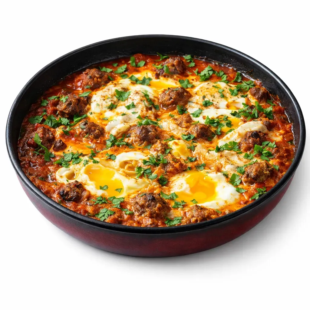 Dive into the vibrant flavors of Moroccan cuisine with this Kefta Tagine with Eggs, where richly spiced meatballs simmer in a robust tomato sauce, culminating in luscious poached eggs. Perfect for brunch or a satisfying main course.