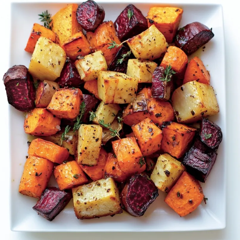 Roasted Root Vegetables is a savory and wholesome side dish that showcases the natural sweetness and depth of flavor found in root vegetables. The recipe involves cutting a variety of vegetables such as carrots, parsnips, beets, and sweet potatoes into even chunks.