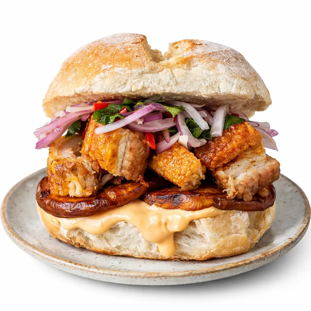 Experience the vibrant flavors of Peru with Pan con Chicharron, an exquisite sandwich comprising tender, crispy-skinned pork belly, fried sweet potato, a tangy salsa criolla, and yellow chili mayo, sandwiched within a fresh bread roll. Perfect for breakfast or any meal of the day!