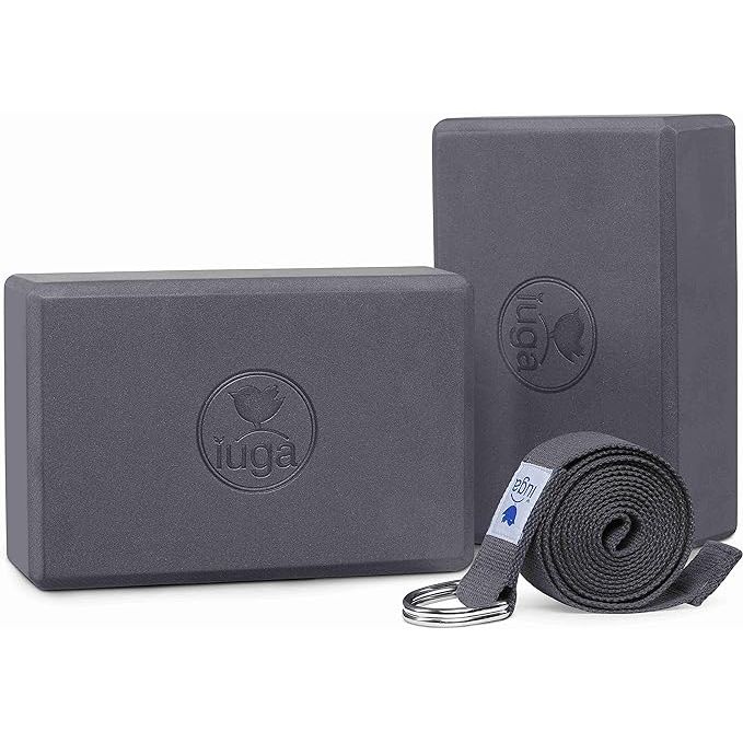 The IUGA Yoga Blocks 2 Pack with Strap are designed to help improve strength, balance, and flexibility during yoga, Pilates, and meditation sessions. The set includes two 9"x6"x3" blocks made of high-density materials for added stability and support.