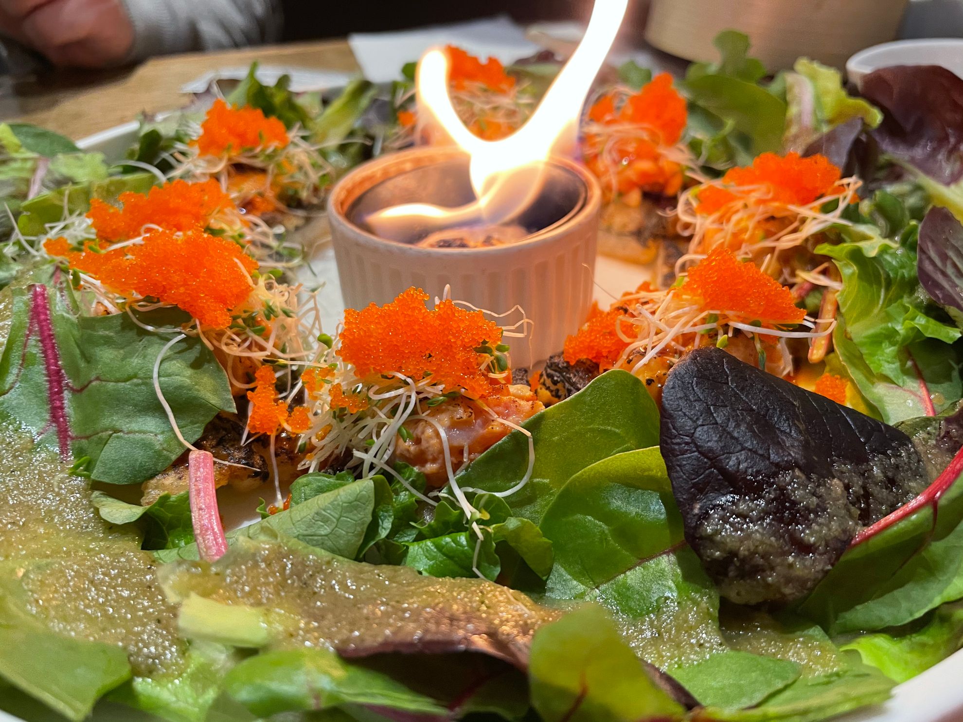 Deep fried seaweed, rice, tuna, salmon, chopped scallops mixed with spicy mayo, alfalfa, tobiko, spring mix