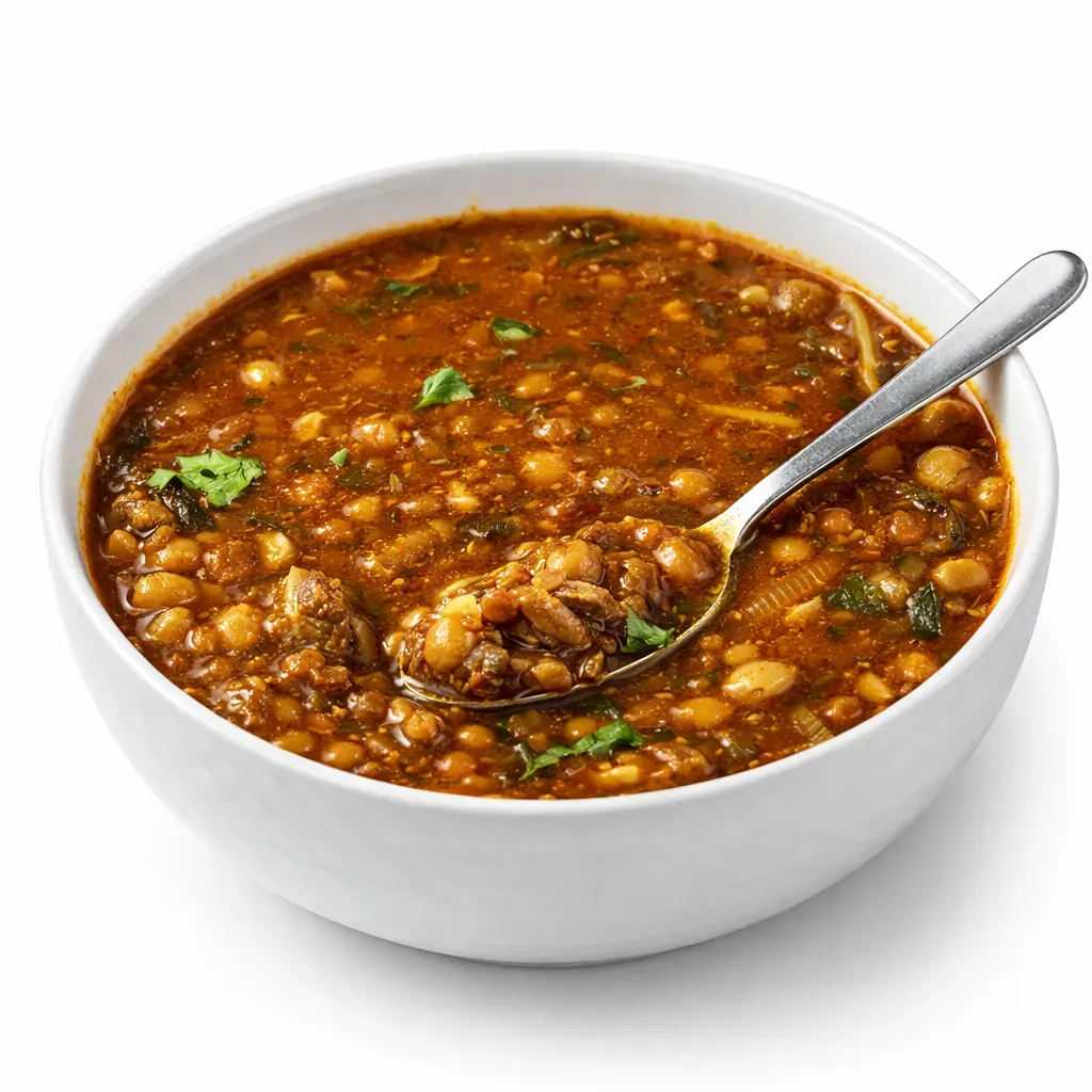 A traditional Moroccan dish, Harira is a hearty and aromatic soup packed with spices, meats, and legumes, perfect for a comforting meal. It's easily customizable to fit vegan and gluten-free diets.