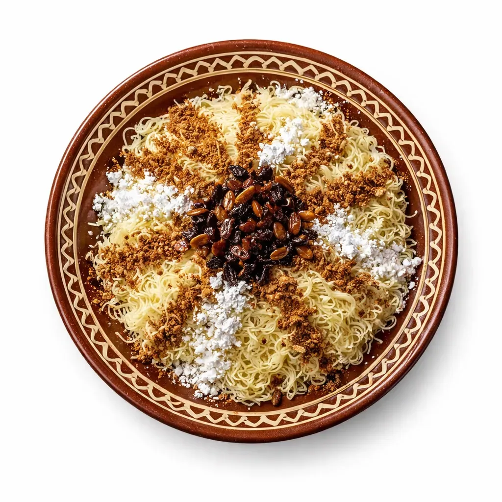 Indulge in the exquisite flavors of Morocco with Seffa Medfouna, a dish that beautifully marries the sweet and savory. Tender chicken, seasoned with aromatic spices, is enveloped in the light, silky strands of steamed vermicelli, crowned with caramelized raisins and a dusting of cinnamon and sugar.