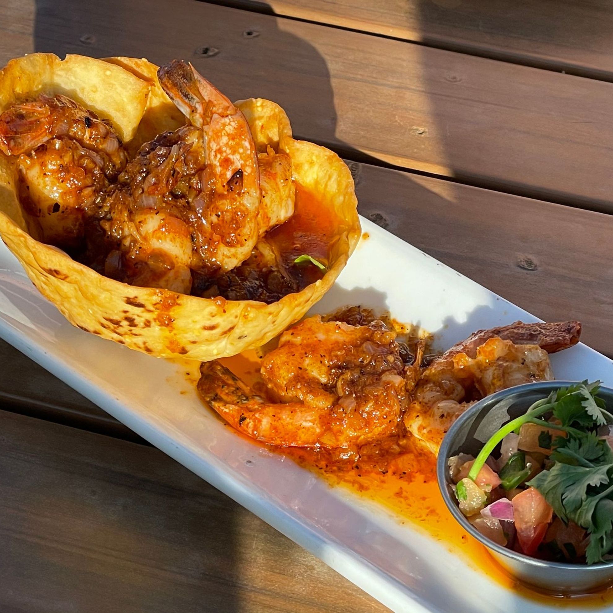 succulent prawns pan seared with tequila fresh lime & spicy chipotle topped with fresh cilantro served in a tortilla shell with pico de gallo