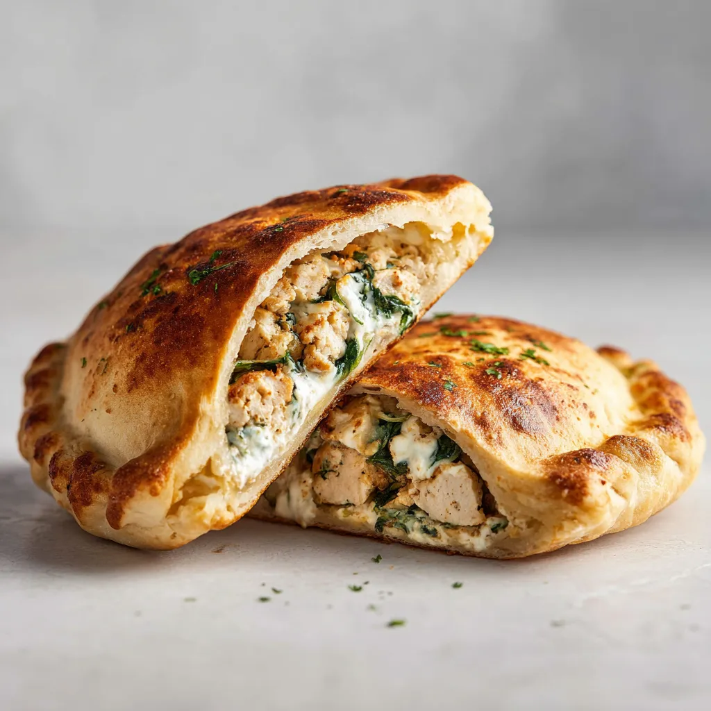 A low-calorie, high-protein calzone filled with lean chicken, cream cheese, spinach, and sun-dried tomatoes, perfect for meal prepping and quick dinners.