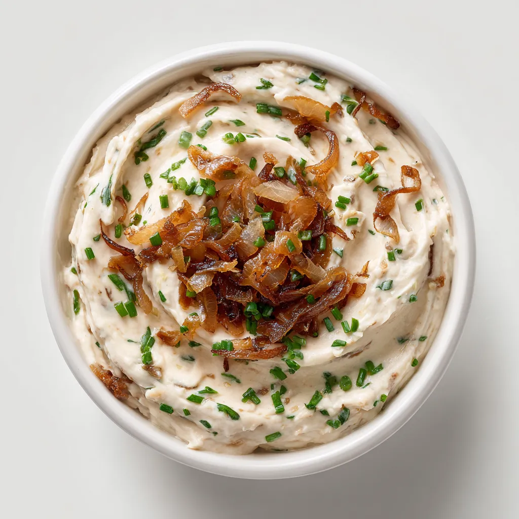 A vegan and gluten-free appetizer featuring creamy caramelized onions blended with skyr and beans, perfect for gatherings.